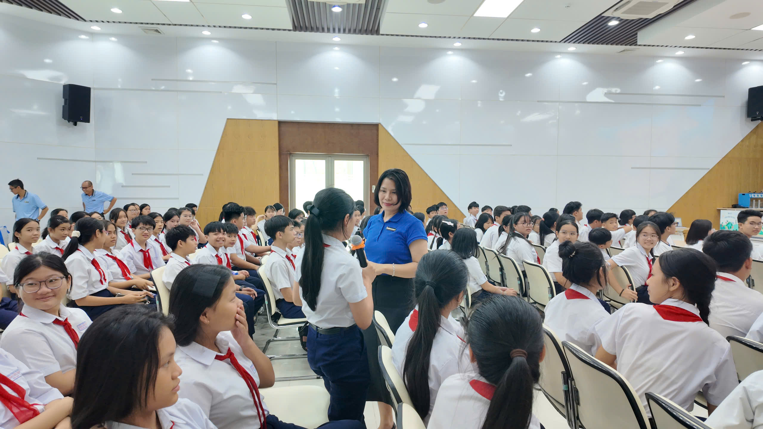 Mỗi ngôi trường tham gia đều mang đến tinh thần học tập tích cực và sự hào hứng rõ nét. Ngay từ những bước chân đầu tiên tới Nhà máy, các em đã được trải nghiệm chuỗi hoạt động đa dạng: tham gia chương trình tại hội trường, trực tiếp thực hành thí nghiệm xử lý nước, cho đến tham quan thực tế quy trình sản xuất nước sạch. Nội dung bài giảng được xây dựng công phu, kết hợp với hình ảnh và video minh họa sinh động, được các giảng viên truyền tải một cách rõ ràng, dễ hiểu, giúp các em tiếp cận kiến thức một cách trực quan và hiệu quả.