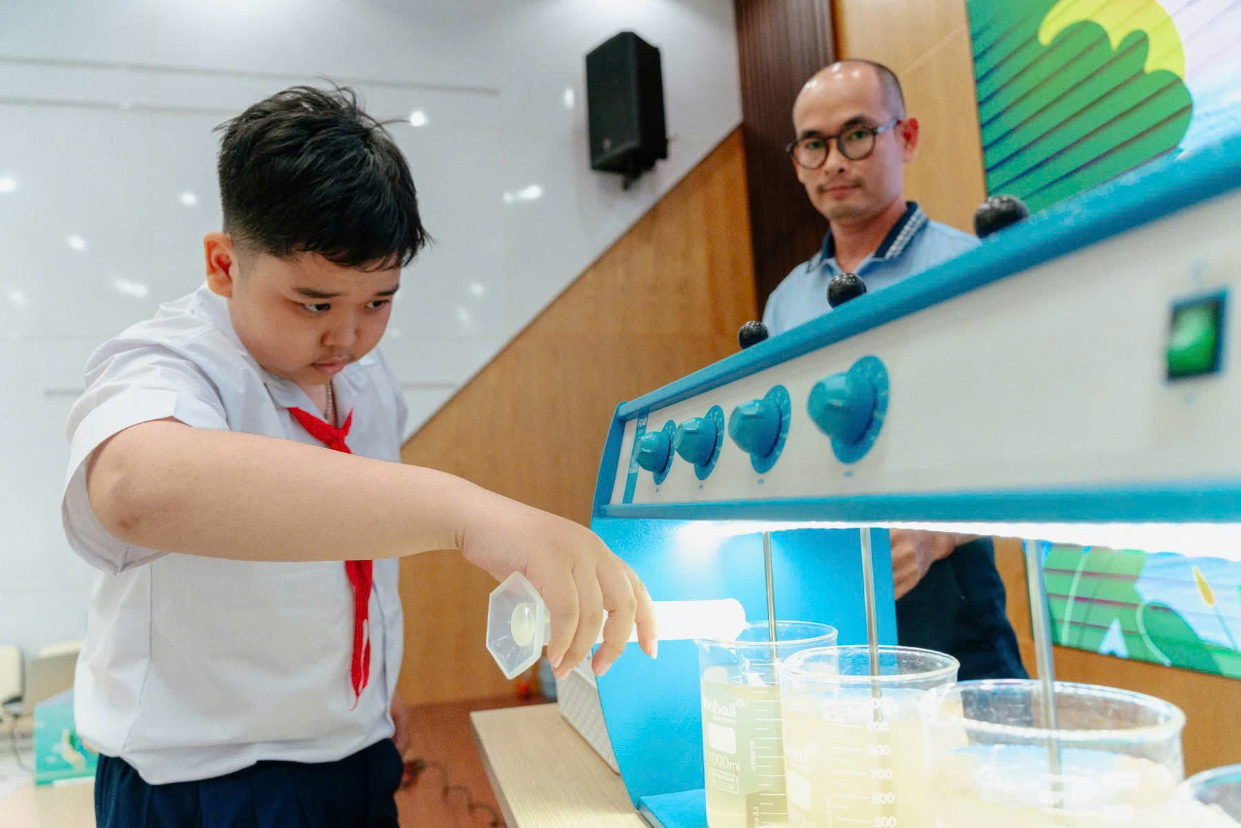 Các em học sinh THCS Lê Hồng Phong thực hành thí nghiệm xử lý nước và tham quan thực tế quy trình sản xuất nước sạch
