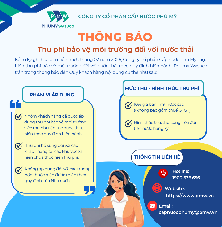 Kể từ kỳ ghi hóa đơn tiền nước tháng 02 năm 2026, Công ty Cổ phần Cấp nước Phú Mỹ thực hiện thu phí bảo vệ môi trường đối với nước thải theo quy định hiện hành. Phumy Wasuco trân trọng thông báo đến Quý khách hàng nội dung cụ thể như sau:
